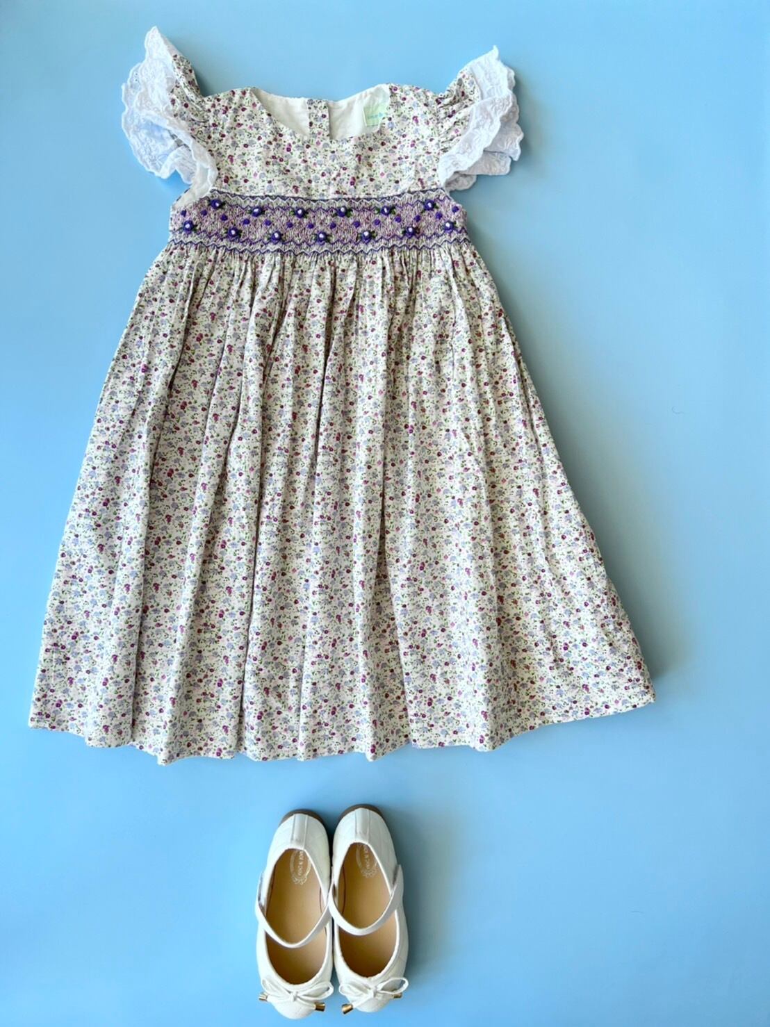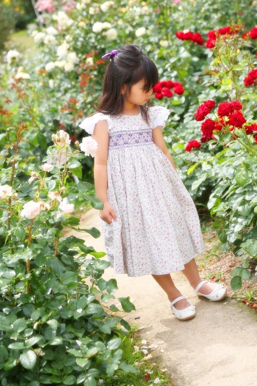 胸元のスモッキングと生地の小花柄をリンクさせました。
