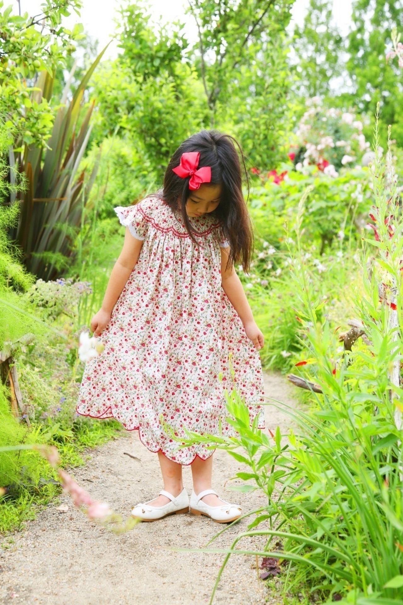 小花柄で透け感があまり気にならないので、こちらは胸のスモッキング裏のみに裏地をつけています。
