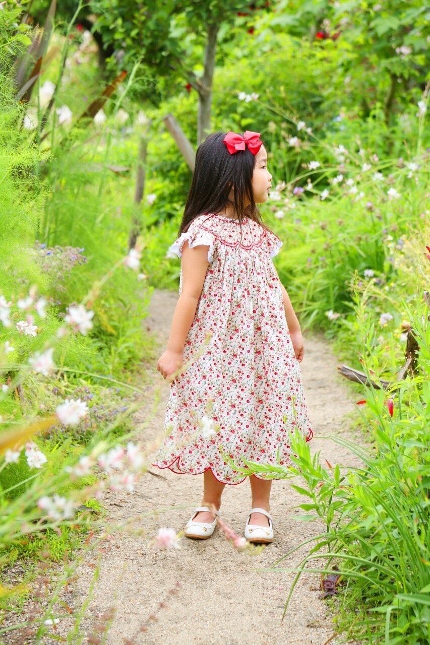 こちらのワンピースは全体的に優しい雰囲気があります。胸の刺繍やワンピースの裾をスカラップ型にしてあり、丸みを出しています。