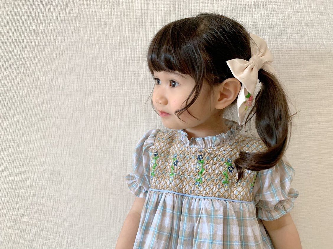 スモッキングワンピースの中でも少しふんわりしたシルエットが可愛らしさを表現しています。